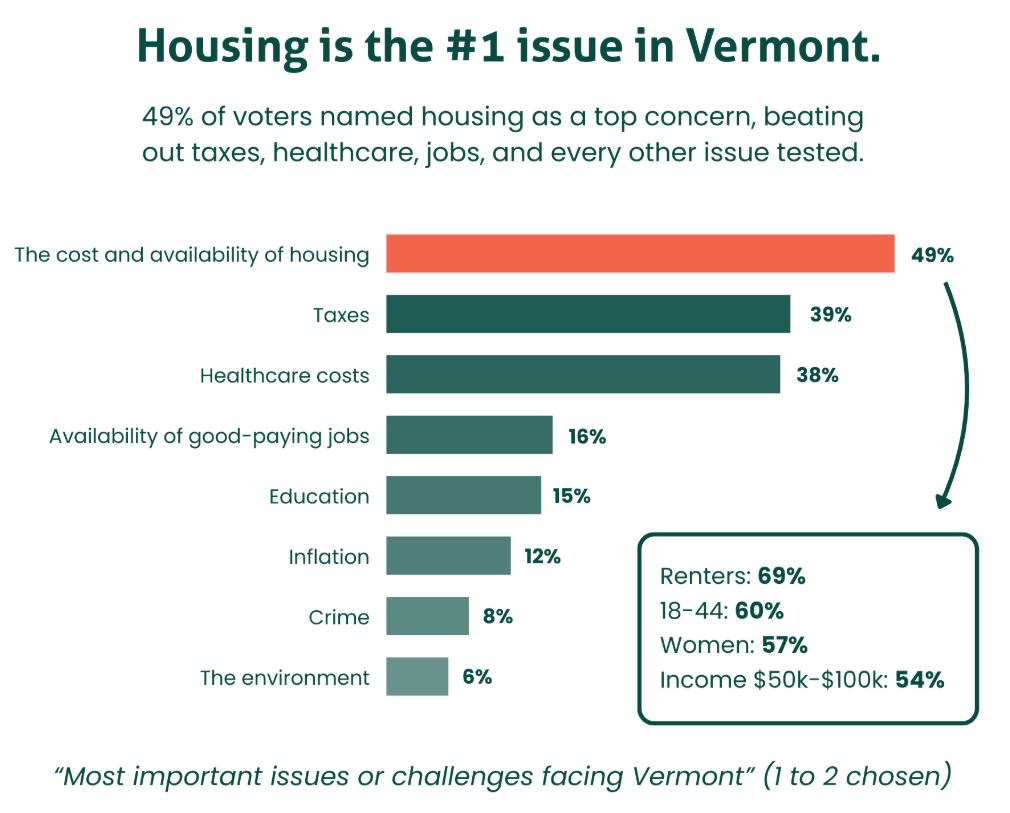 It was also clear that Vermonters want immediate action, with three in four voters saying it is important for the Legislature to take action on housing this year, including 47% who say it is extremely important, and that sentiment is strong across party lines. The Legislature has taken meaningful steps in recent years, but this new data makes clear that Vermonters do not believe the work is done.