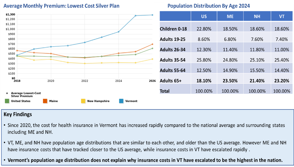 In New Hampshire, commercial insurance costs are lower than the US national average and the state has the lowest proportion of monthly income that goes to pay for health insurance, while VT has the highest. Vermont is, on average, slightly older than New Hampshire but nothing that comes close to explaining these cost deviations.