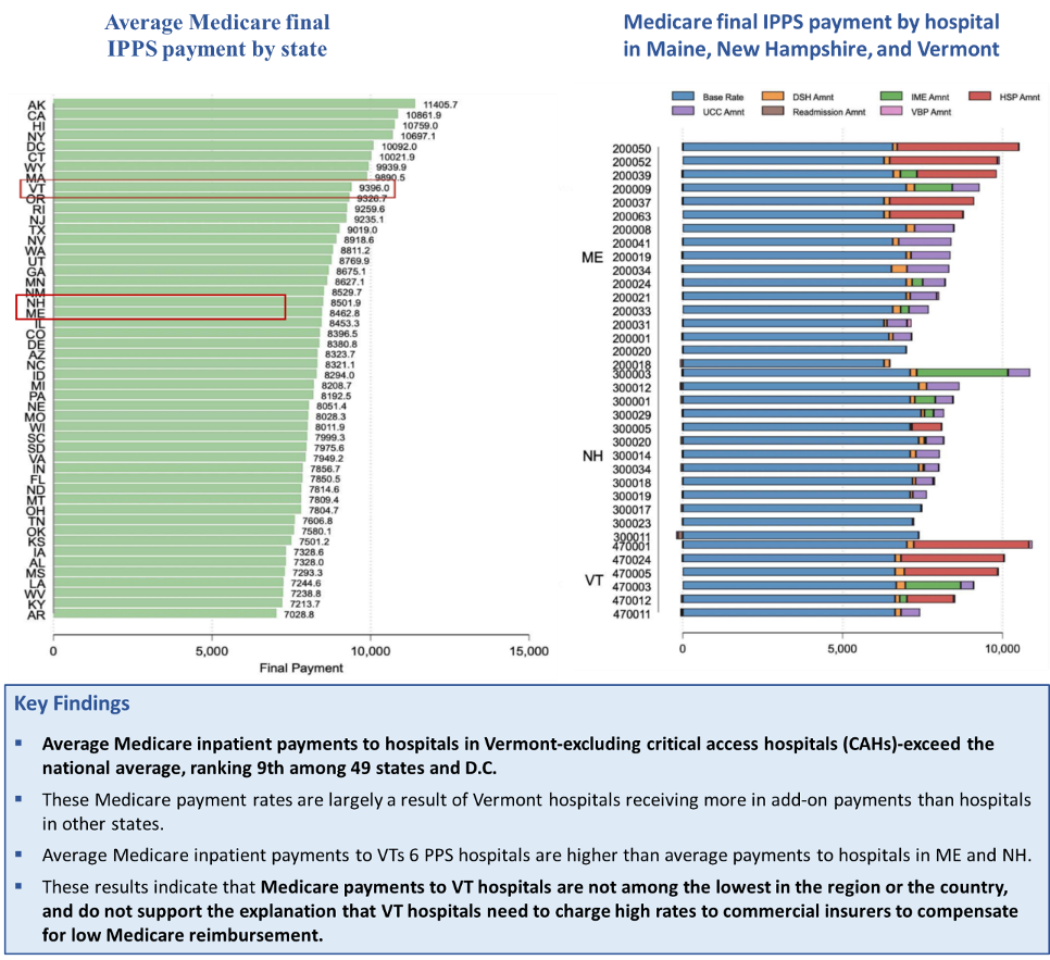 In November 2025, a team of economists at the Center for Advancing Health Policy through Research (CAHPR) at the Brown University School of Public Health produced an analysis of Medicare Final Payment Rates in Vermont for the Green Mountain Care Board (GMCB). The analysis showed that average Medicare inpatient payments to Vermont hospitals (excluding critical access hospitals) exceeds the national average and ranks 9th highest among 49 states and the District of Columbia (Maryland is excluded from the analysis due to operating under global budgets).