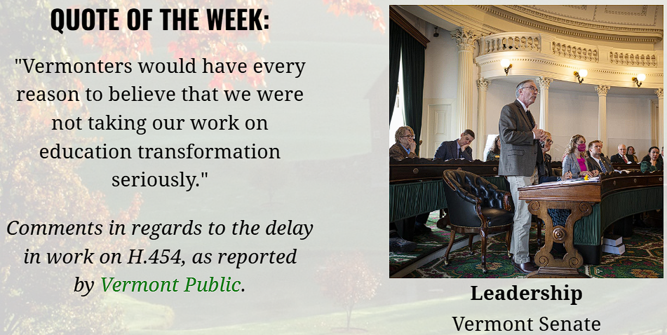 The most significant event in Montpelier this week is the one that almost didn't happen... Sensing that the education reform bill (H.454) was going to have some challenges on the Senate floor, we issued an action alert on Monday. Those concerns turned out to be well-founded when Senate leadership announced on Tuesday that they were pulling the bill back from the floor.